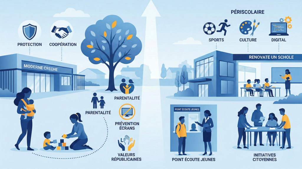 À l’école, la municipalité sera pleinement engagée : amélioration des locaux, lutte contre le harcèlement, promotion des valeurs républicaines, partenariats culturels et rénovation prioritaire des établissements.