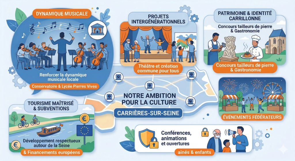 La culture n’est pas un luxe : elle donne une âme à la ville, relie les générations et renforce son attractivité. Notre ambition est d’affirmer une identité culturelle forte, enracinée dans l’histoire de Carrières-sur-Seine et accessible à tous.