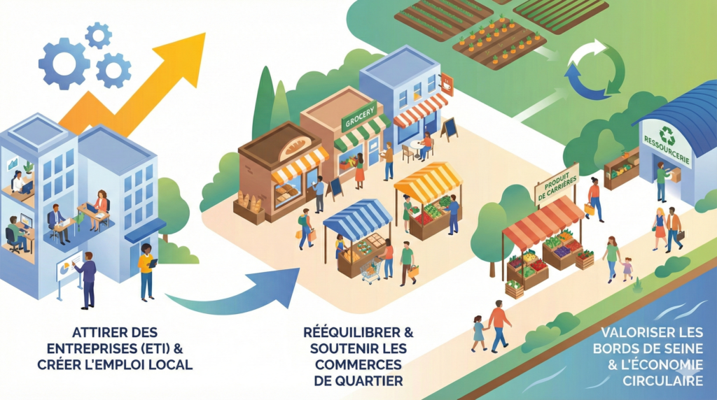 Carrières-sur-Seine doit retrouver un dynamisme économique à la hauteur de son potentiel. Une ville attractive n’est pas seulement résidentielle : elle crée de l’activité, soutient ses commerces et valorise ses ressources locales. Notre ambition est claire : faire vivre nos quartiers et développer l’emploi de proximité.