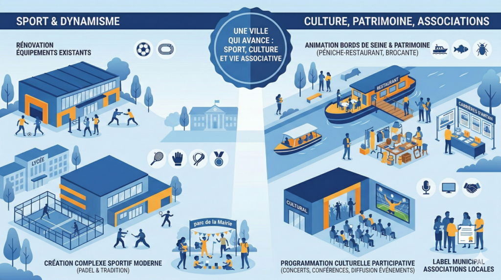 Nous valoriserons nos atouts naturels et patrimoniaux : animation des bords de Seine, péniche-restaurant, balades fluviales, exposition « Carrières d’antan » et retour d’événements populaires comme la brocante.